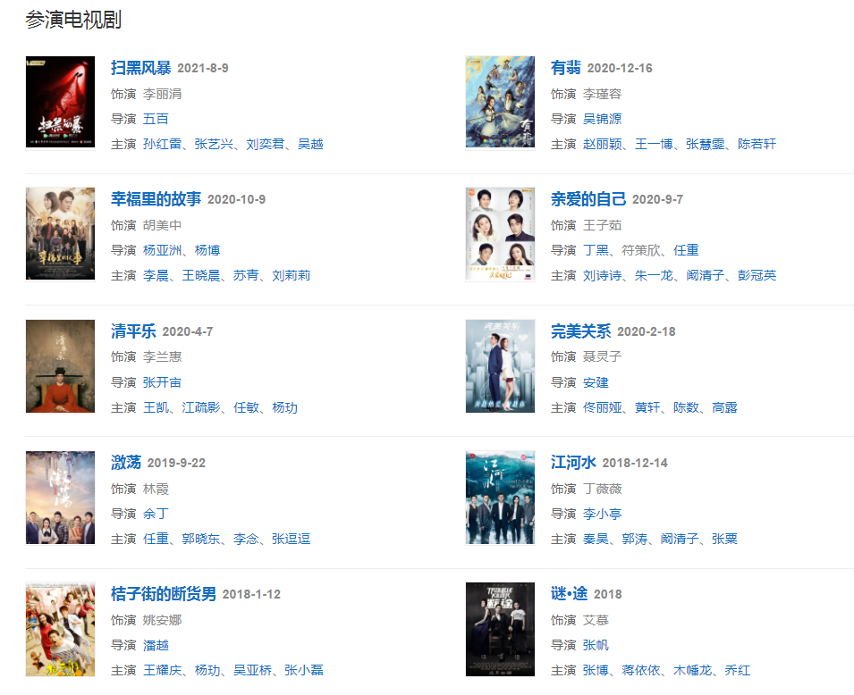 202189日,出演當(dāng)代涉案劇《掃黑風(fēng)暴》播出,在劇中飾演馬帥的妻子李麗涓。