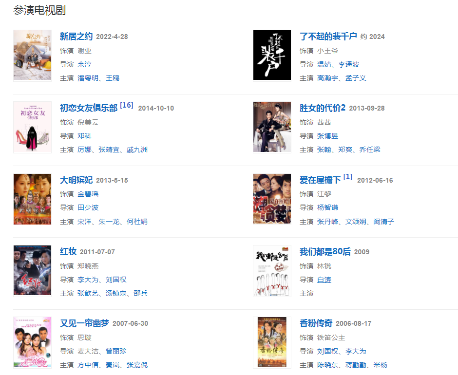 2011年,出演張丹峰、文頌嫻主演的悲情劇《愛在屋檐下》,在劇中飾演大氣而善良的完美千金小姐江黎。