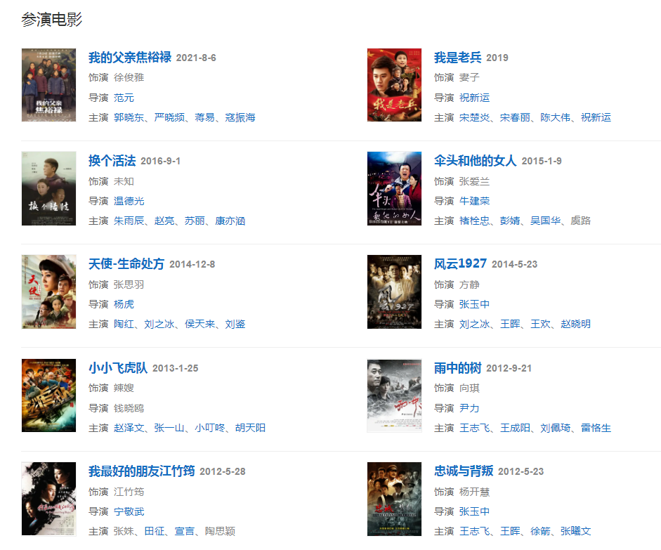 代表作品:初心、海棠依舊、江姐、八月一日、傘頭和他的女人