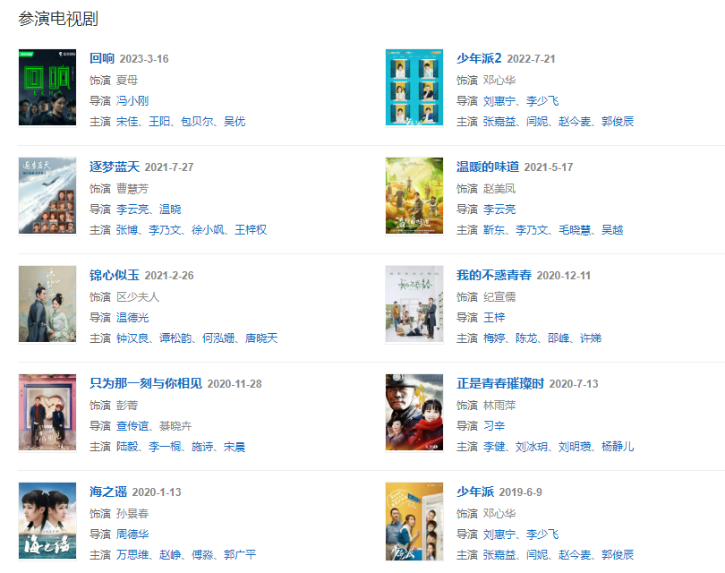 2021年,主演的當代農(nóng)村劇《溫暖的味道》播出。727日,領銜主演的電視劇《逐夢藍天》開播  ;參演電視劇《錦心似玉》。
