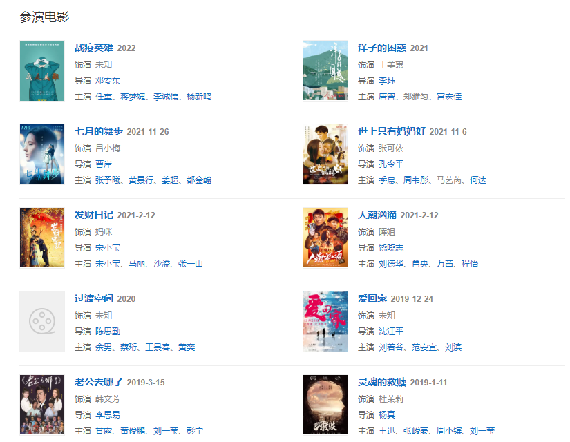 20221月,參演奇幻喜劇《童年快樂》同月28日,主演電視劇《人世間》,在劇中飾演喬春燕; 215日,參加《2022年中央廣播電視總臺(tái)元宵晚會(huì)》;520日,參加的音樂競(jìng)演綜藝《乘風(fēng)破浪第三季》播出;525日,參與《突襲訓(xùn)練室》。