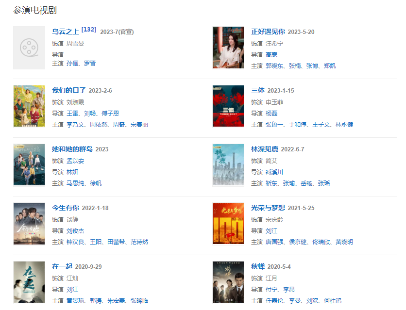 代表作品:像霧像雨又像風(fēng)、來不及說我愛你、功勛、夜幕下的哈爾濱、大丈夫、大河兒女、姐妹兄弟、美好生活