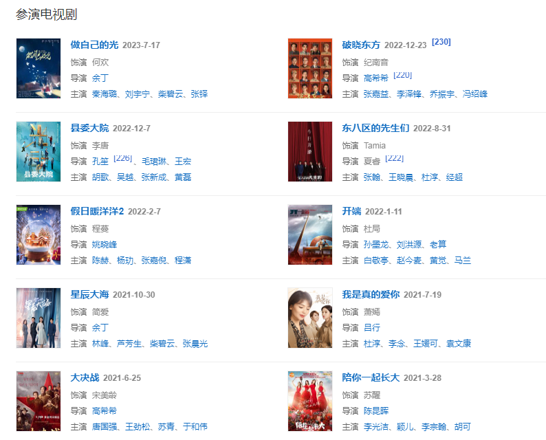 代表作品:瑯琊榜、歡樂(lè)頌、白蛇傳、老有所依、羋月傳、媽祖、天龍八部、大軍師司馬懿之軍師聯(lián)盟、外來(lái)媳婦本地郎、星辰大海、最好的時(shí)光、勇敢愛(ài)情、說(shuō)不出口、傷了心的女人怎么了、紅顏舊