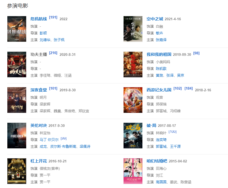 2017年,她三度登上央視春晚舞臺(tái);同年,主演古裝劇《虎嘯龍吟》;同年,主演的動(dòng)作片《英倫對(duì)決》上映。