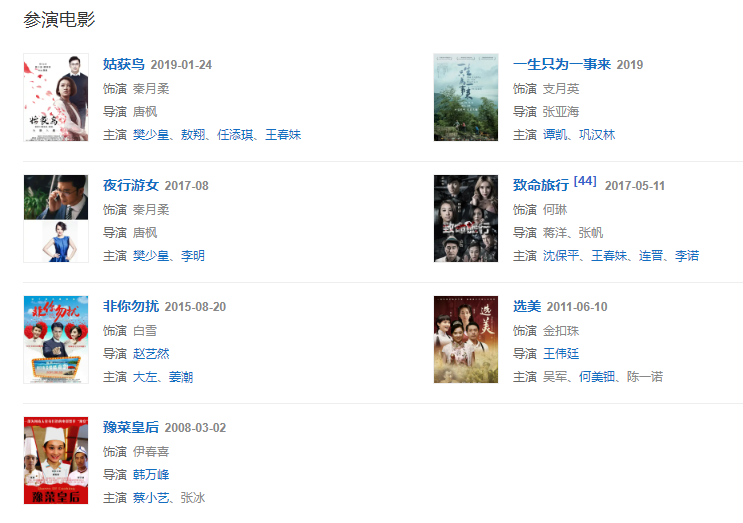 2007年,因出演古裝武俠劇《楚留香傳奇》中柳無(wú)眉一角而走入大眾的視線。