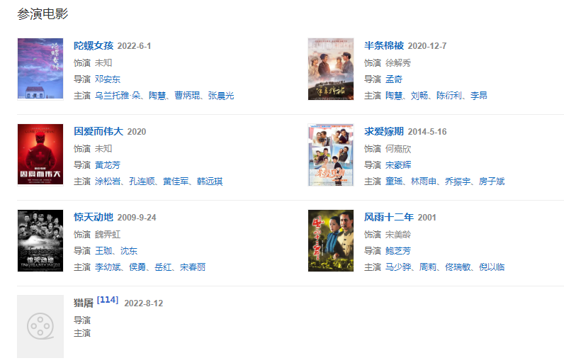2019年,出演獻(xiàn)禮電影《半條棉被》 。