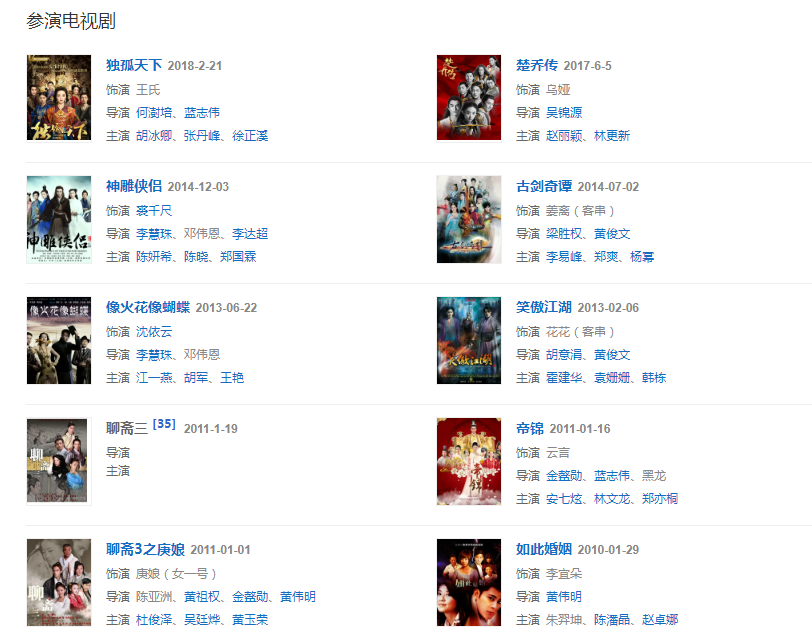 2002年出演古裝神話劇《齊天大圣孫悟空》。2004年出演古裝奇幻劇《仙劍奇?zhèn)b傳》  。