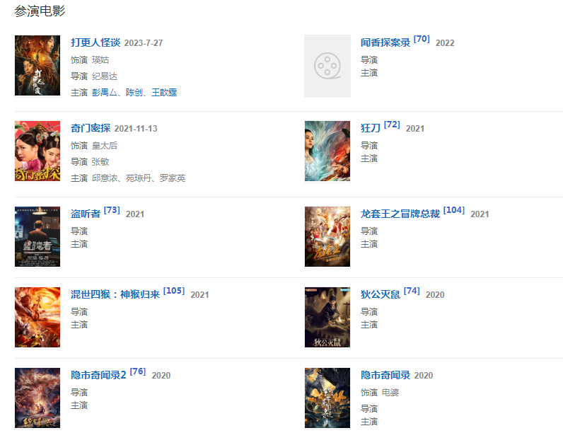 2021330日,出演電視劇《玉昭令第一季》播出;92日,其出演的奇幻喜劇《霧都奇遇夜》在中山影視城舉行開機(jī)儀式;1113日,主演電影《奇門密探》在愛奇藝視頻全網(wǎng)獨(dú)播。