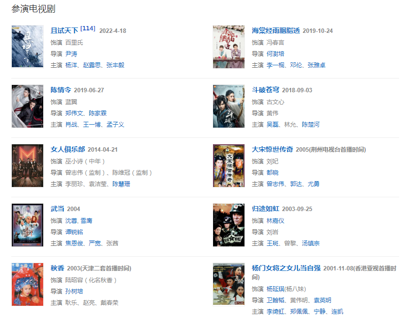2001年,在古裝作品《楊門女將》中飾演女主角楊延琪。