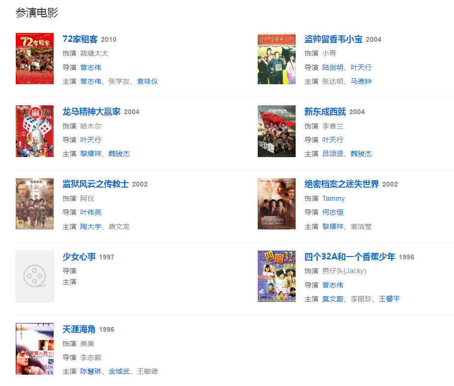 代表作品《陀槍師姐》《倚天屠龍記》《美味情緣》《尋秦記》《雪山飛狐》