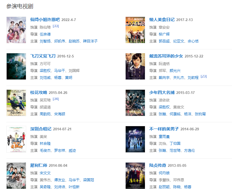 2015317日,參演的古裝劇《少年四大名捕》在湖南衛(wèi)視播出 ;同年主演民國愛情劇《戴流蘇耳環(huán)的少女》  。