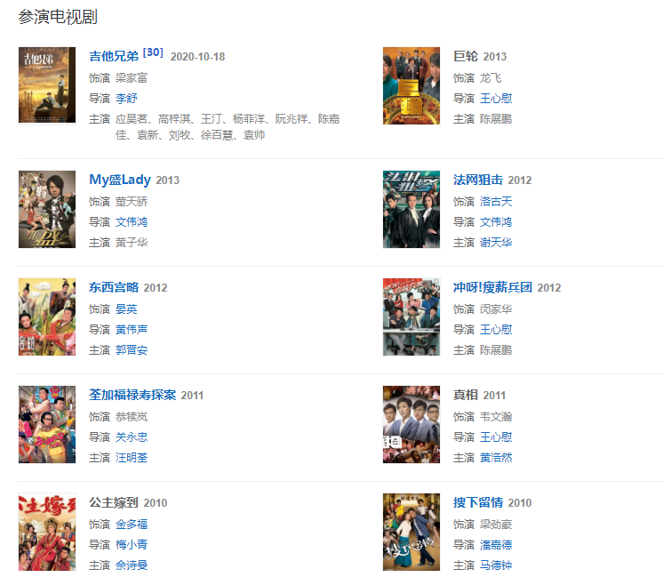 2003年,與薛家燕、苑瓊丹、林文龍共同出演時(shí)裝喜劇《皆大歡喜》,飾演不修篇幅、好逸惡勞的劉錦。2005731日,主演的時(shí)裝喜劇《窈窕熟女》在香港翡翠臺(tái)播出,在劇中飾演為人魯鈍的畢奇理偵探社員工董輝。