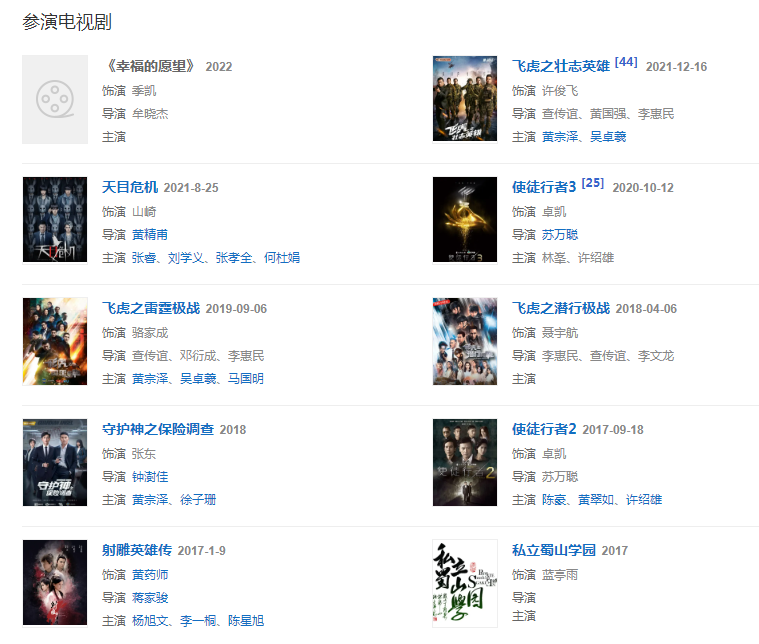 2021年,主演的懸疑軟科幻網劇《天目危機》在芒果TV全網獨播;同年,主演的警匪懸疑劇《飛虎之壯志英雄》在優(yōu)酷播出。