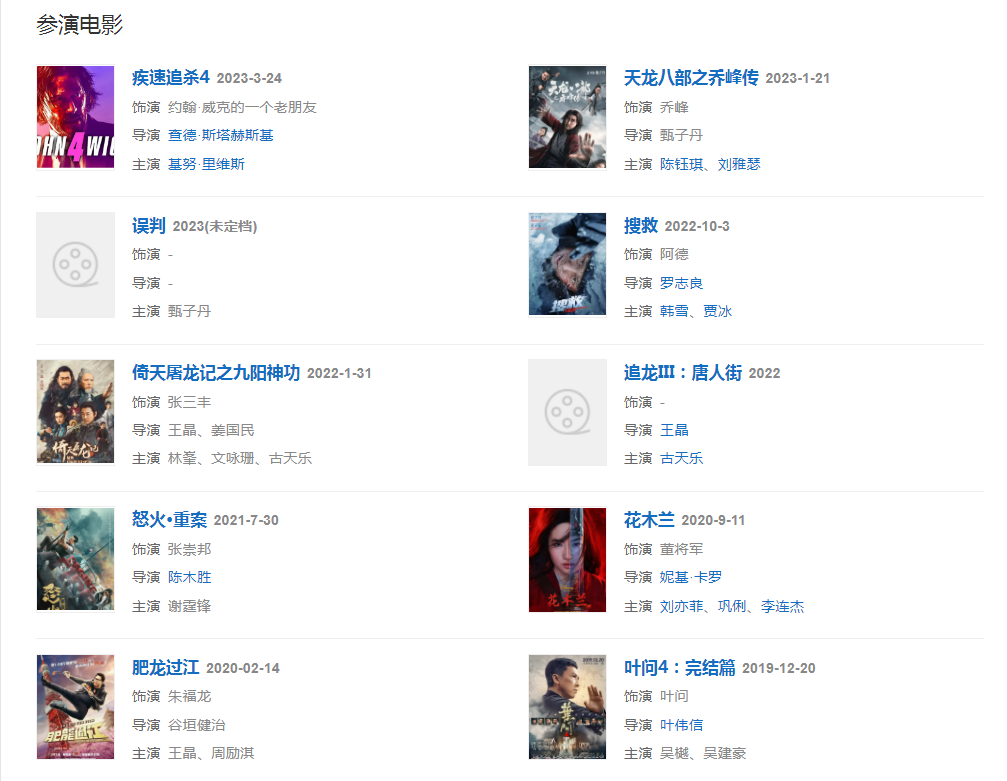 2022131日,出演《倚天屠龍記之九陽(yáng)神功》。同年5月,甄子丹監(jiān)制及主演的電影《天龍八部之喬峰傳》在戛納驚艷亮相。