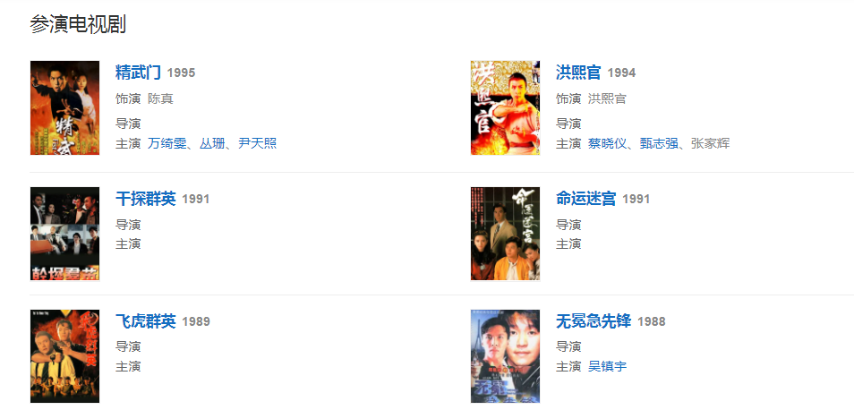 代表作品:葉問(wèn)、導(dǎo)火線、殺破狼、追龍、武俠、錦衣衛(wèi)、十月圍城、關(guān)云長(zhǎng)、西游記之大鬧天宮、戰(zhàn)狼傳說(shuō)