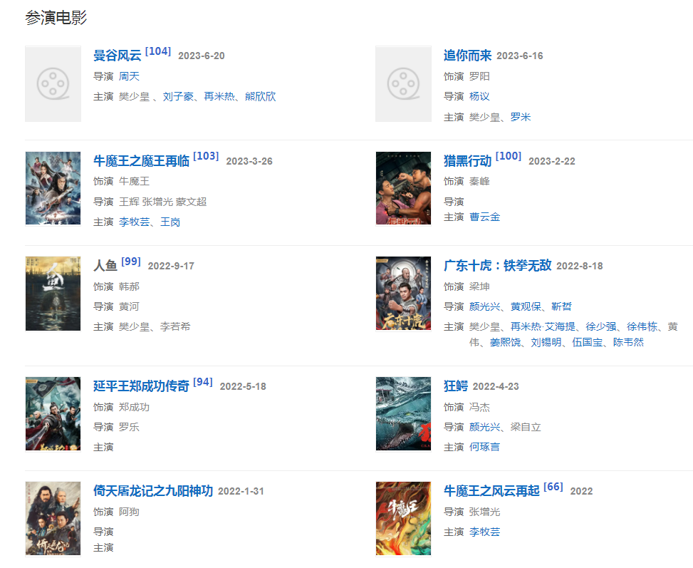 2023年2月22日,參演的電影《獵黑行動(dòng)》在騰訊視頻首播;3月26日,主演的電影《牛魔王之魔王再臨》上線。6月20日,領(lǐng)銜主演的電影《曼谷風(fēng)云》在騰訊視頻首播。