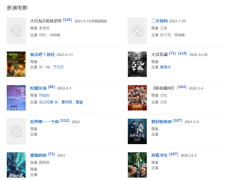 代表作品情義無價、京城四少、日正當中、明宮謎案、大當家、那年花開月正圓、西虹市首富、都挺好、辣媽正傳