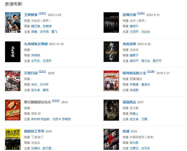 1966年擔(dān)任動(dòng)作片《大醉俠》動(dòng)作指導(dǎo)。20世紀(jì)70年代創(chuàng)立動(dòng)作電影班底洪家班 ;