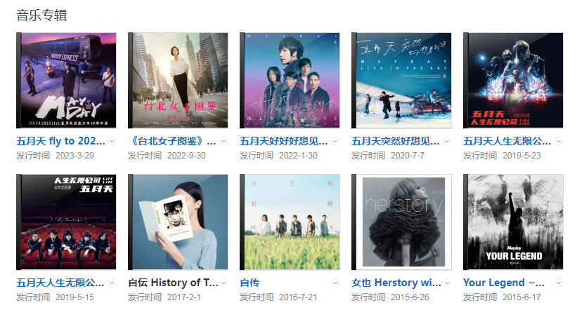 代表作品:溫柔、倔強、突然好想你、知足、戀愛ing、擁抱、我不愿讓你一個人、你不是真正的快樂、后來的我們、諾亞方舟、天使、憨人、如煙、后青春期的詩、傷心的人別聽慢歌、步步、如果我們不曾相遇